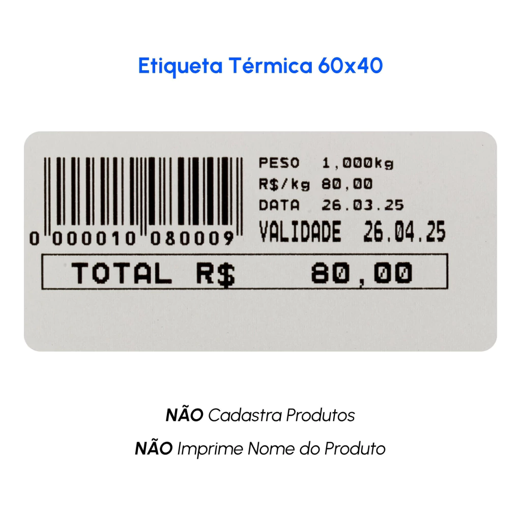 Não. Este modelo gera etiqueta simplificada (peso, preço, código). Para etiquetas com nome do produto, escolha a Wind D3 Super.