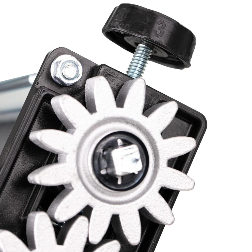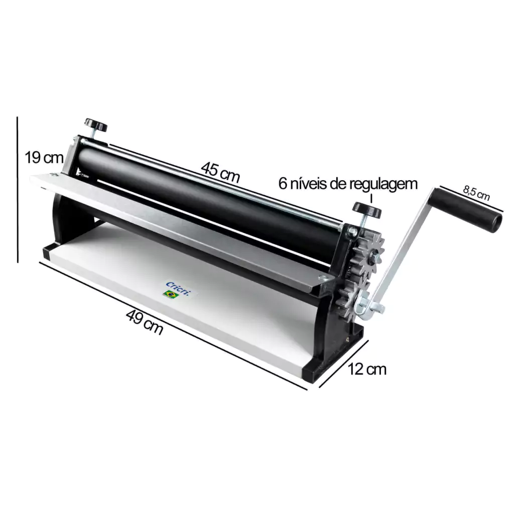 Rolos de 45cm com regulagem de espessura de 0 a 5mm: o maior entre os manuais do mercado, pensado para quem precisa de produtividade com padrão profissional.