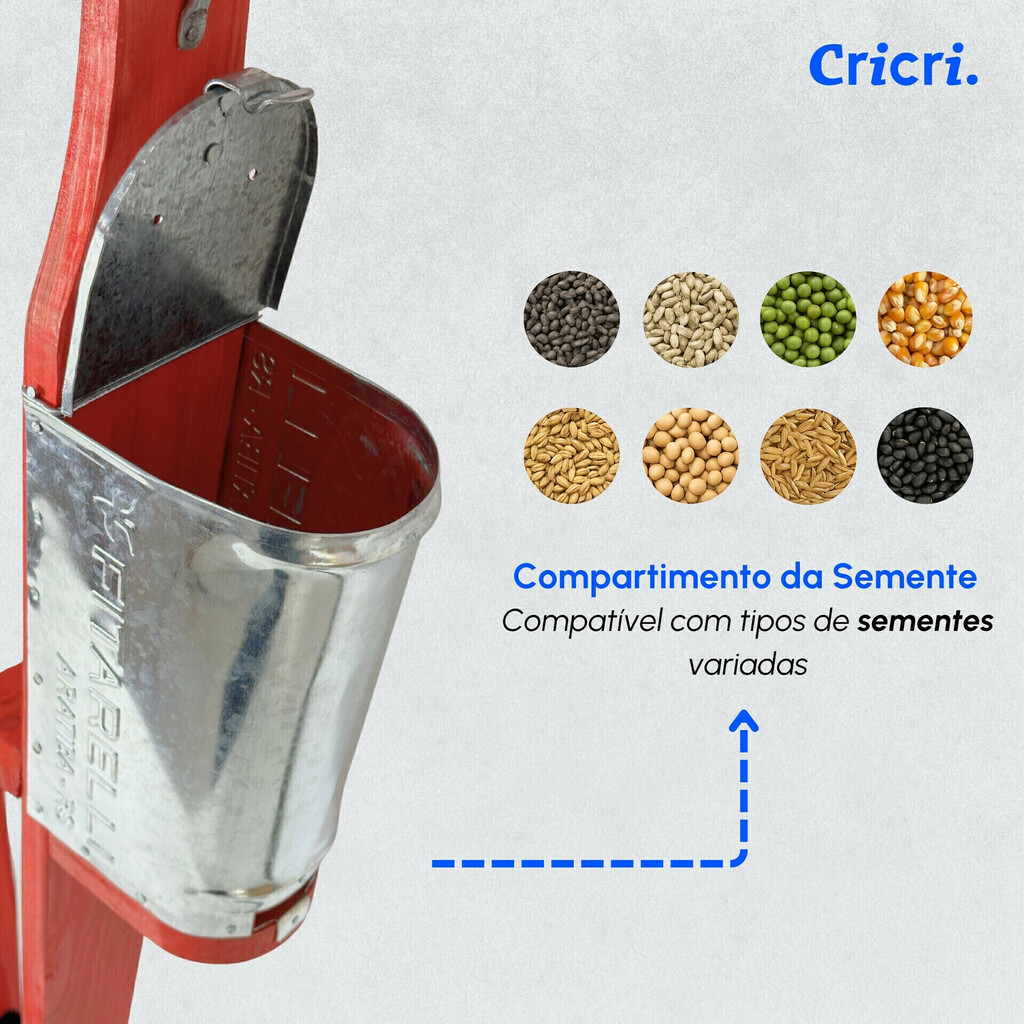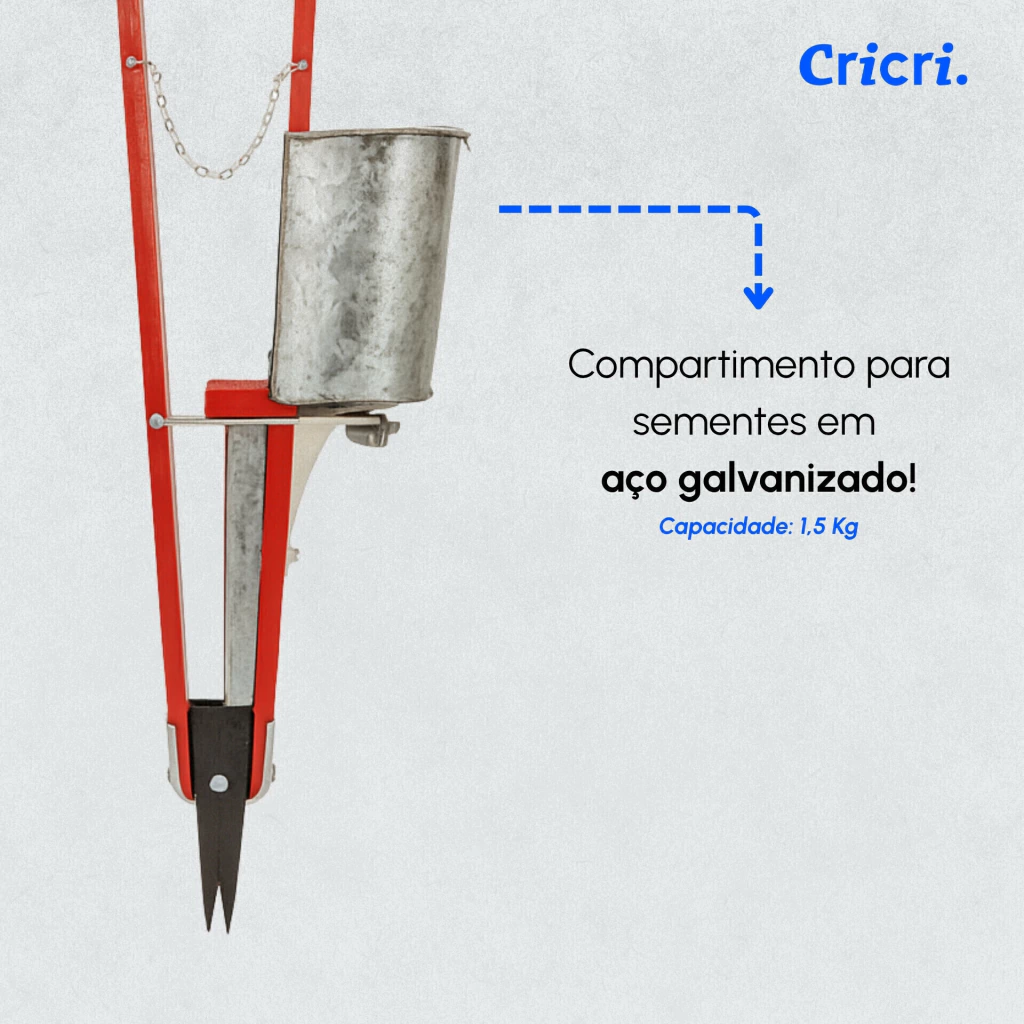 Compartimento de sementes em aço galvanizado > Resistente à corrosão e ideal para uso prolongado, com capacidade de 1,5 kg.