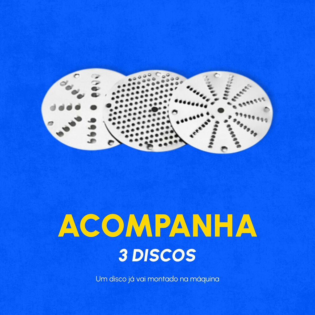 Discos inclusos: 1 ralador/triturador, 1 desfiador 5mm, 1 desfiador 8mm